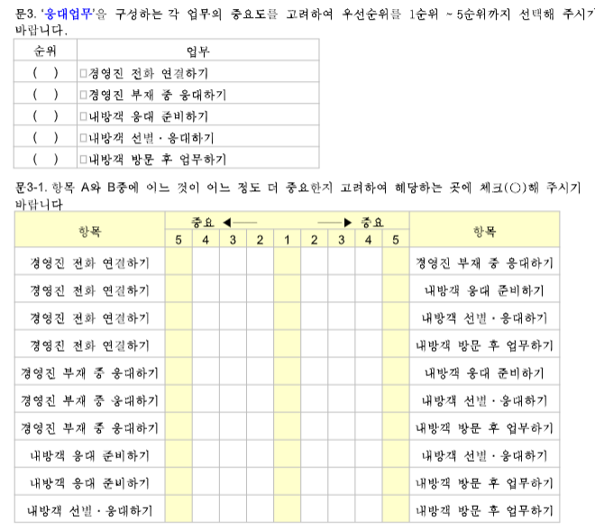 비교해야할 문항수가 많을 뿐만 아니라 구성 하는 항목간의 일관성까지 고려해야 하기 때문에 응답자를 전문가로 설정하더라도 일관적인 응답을 얻는 방법은 상당히 어렵습니다.